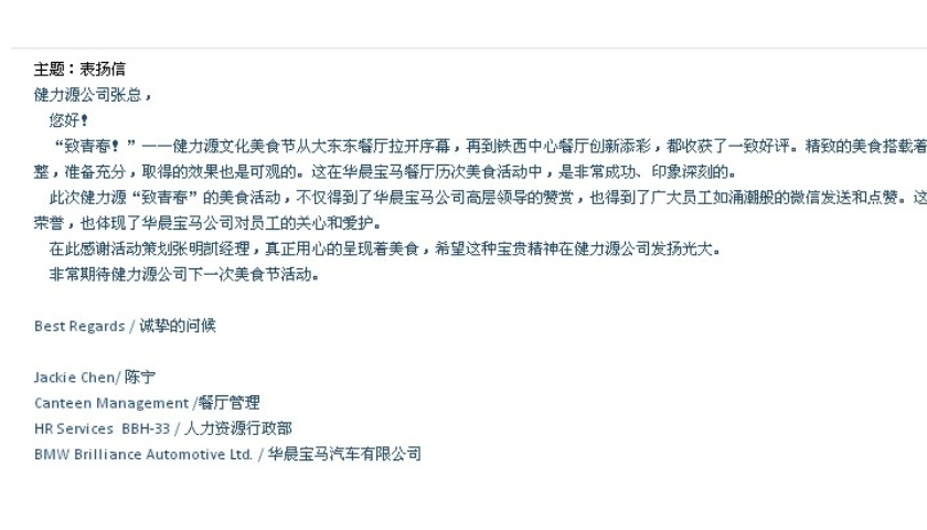 近日,沈陽華晨寶馬30U餐廳接連收到甲方表揚信、感謝信,在信中,甲方對餐廳今年舉辦的創(chuàng)新活動,給予高度認(rèn)可,認(rèn)為創(chuàng)新活動給就餐員工帶去了驚喜,讓午餐之旅充滿期待,充滿了喜悅。