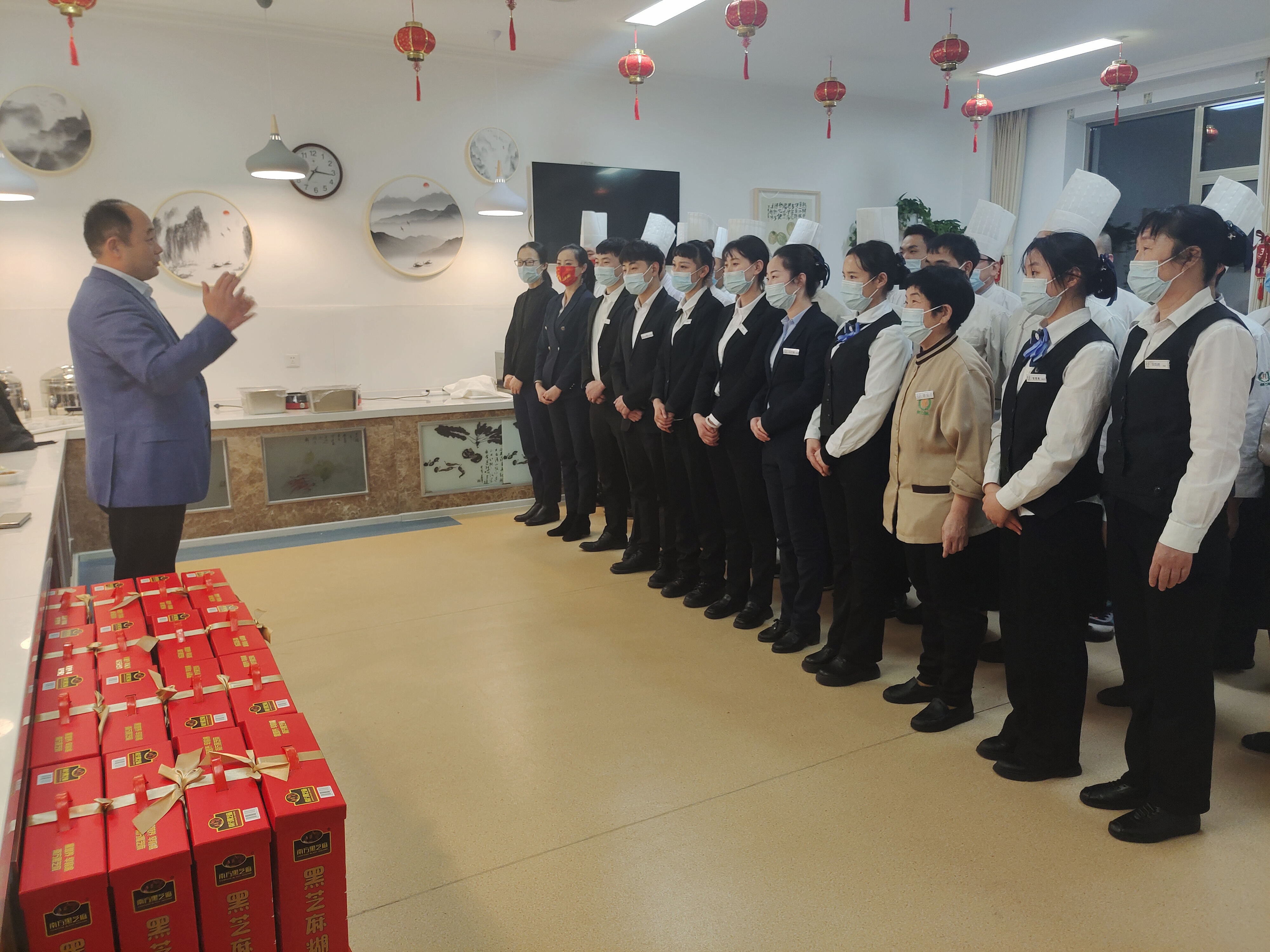 除夕當(dāng)天,薦世新董事長(zhǎng)和公司高層領(lǐng)導(dǎo)前往餐廳走訪慰問(wèn)