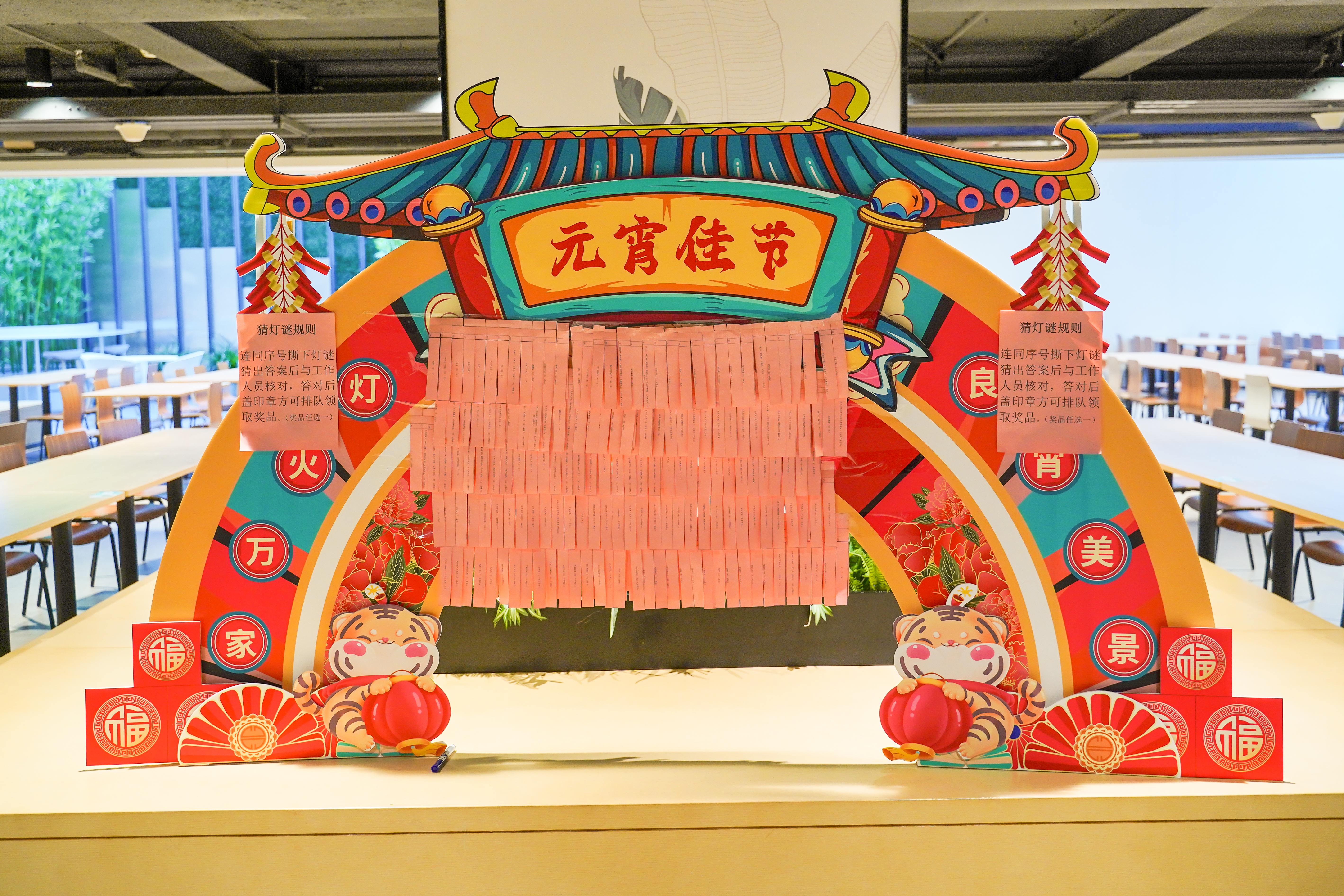 元宵節(jié)當天,各餐廳均是精心裝扮,盛裝亮相。走進寬敞明亮的餐廳,只見五彩斑斕的燈籠下掛著各式燈謎,在中國結、福字的映襯下顯得分外喜慶,引得顧客紛紛駐足。很多顧客一邊用餐、一邊冥思,相互交流,為就餐增添了一份歡樂。凡是猜對燈謎的顧客,還能得到餐廳精心準備的小禮物。