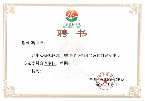 “全國(guó)生態(tài)食材評(píng)定中心專家委員會(huì)副主任”聘書