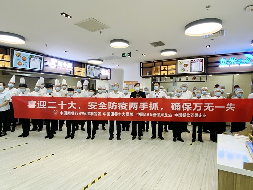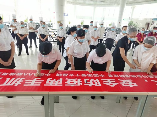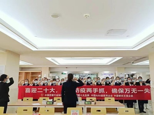 餐廳全員手持橫幅,鄭重宣誓:“在黨的二十大即將召開之際,我鄭重承諾:堅守安全紅線,全面落實崗位安全責任制。防范安全及防疫風險,消除安全隱患,不斷學習安全知識,努力提高安全意識,堅決遏制事故發(fā)生,保障餐廳運營安全。以良好的安全態(tài)勢迎接黨的二十大勝利召開。”