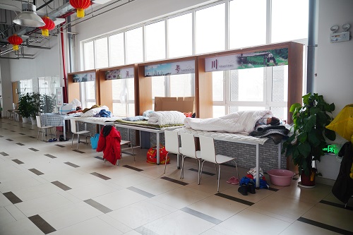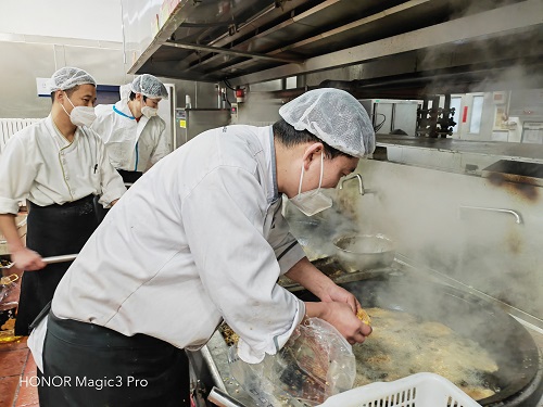 在封閉保障期間,餐廳員工非常辛苦,凌晨四五點,他們就開始工作,每天工作十六七個小時,日供餐量達到3萬份,每餐還要在廠區(qū)內(nèi)完成幾十個地點的送餐。大家一天到晚都處于緊張忙碌之中,長時間的站立還導(dǎo)致部分員工腿腳腫脹。另外,由于臨時封閉,沒有住宿場所,餐廳管理者就帶著員工一起打地鋪、睡桌子。整個保障過程的困難和艱辛可想而知。