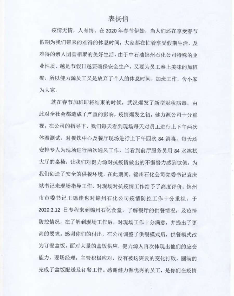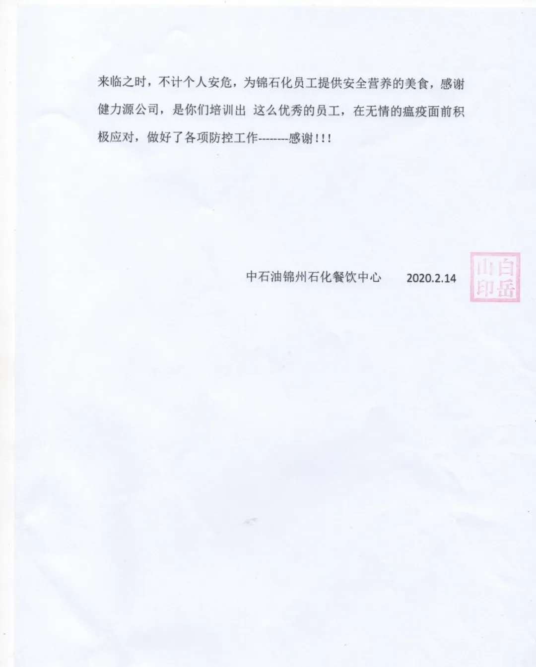 錦州石化餐廳獲得客戶表?yè)P(yáng)信