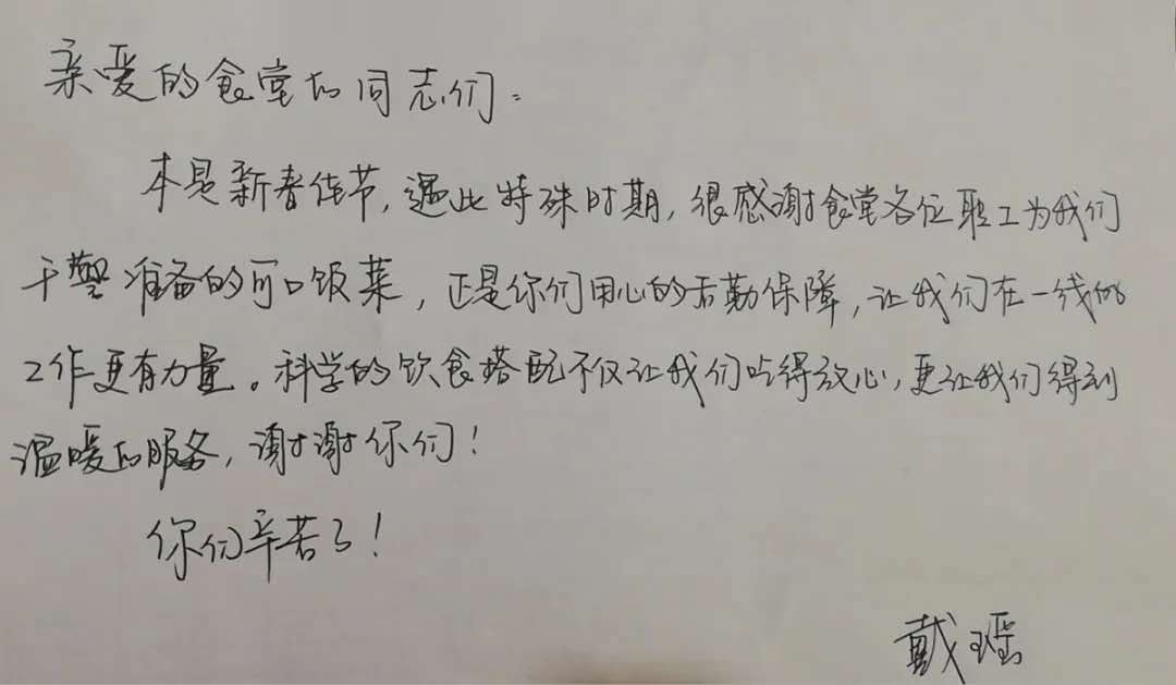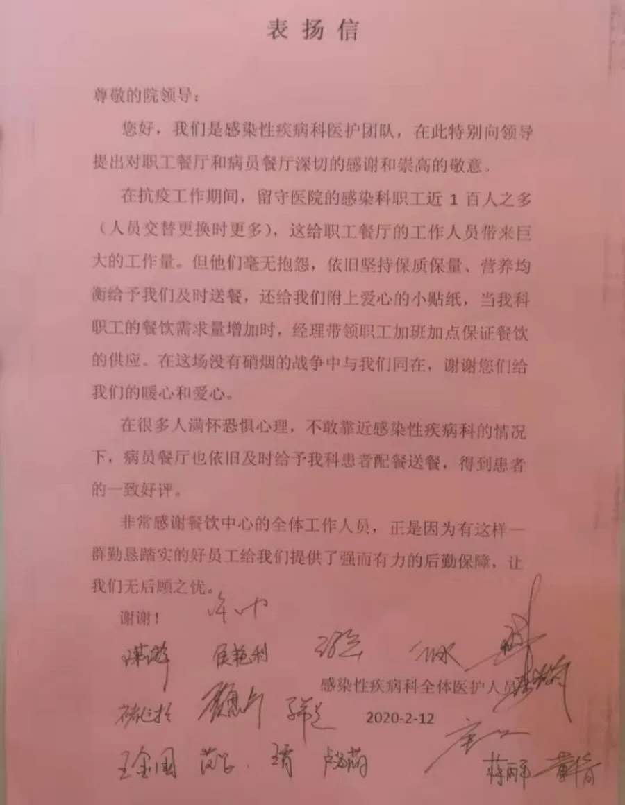 濟(jì)寧醫(yī)學(xué)院附屬醫(yī)院感染科全體醫(yī)護(hù)人員對(duì)餐廳工作提出表?yè)P(yáng)