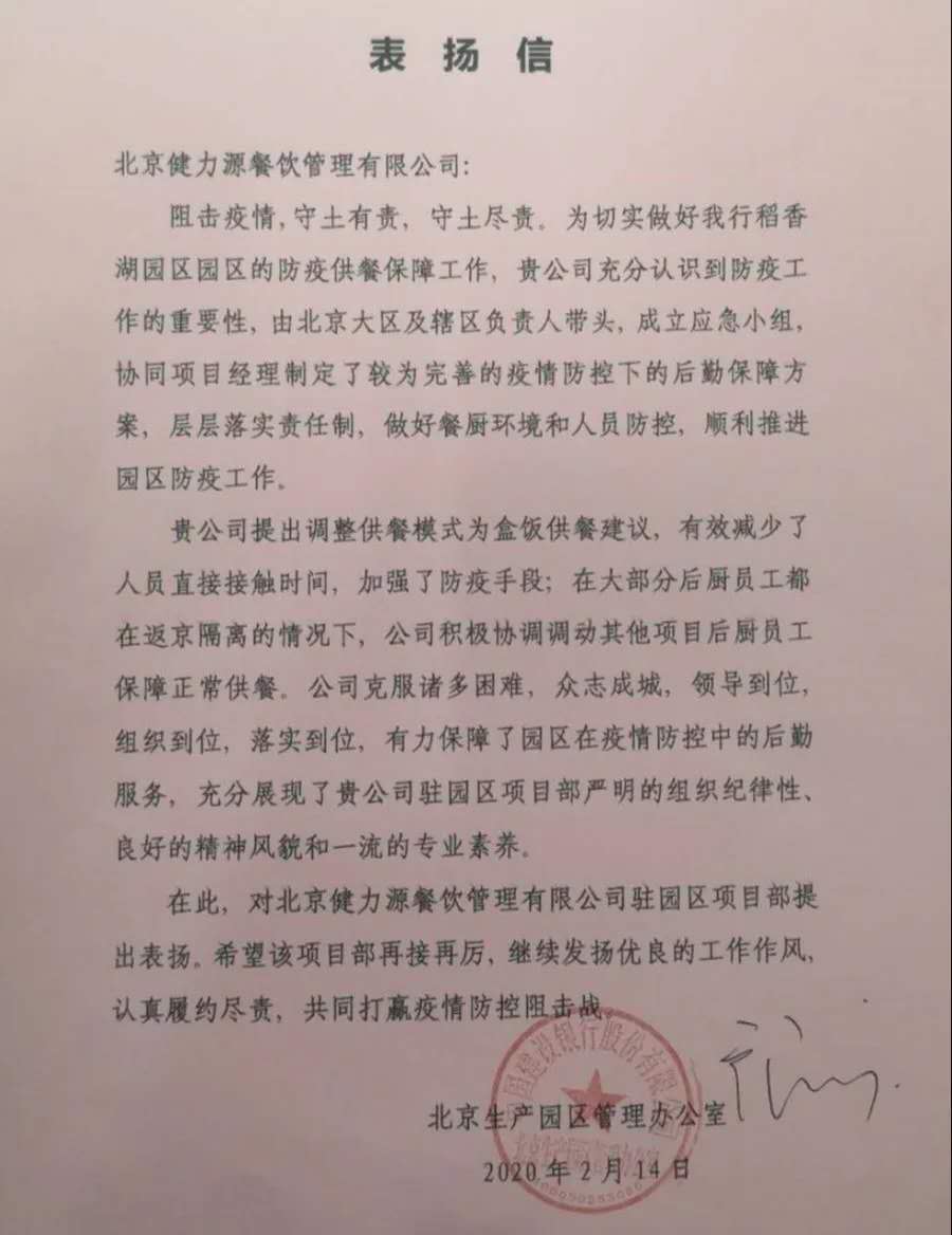 建行稻香湖園區(qū)餐廳收到客戶表?yè)P(yáng)信