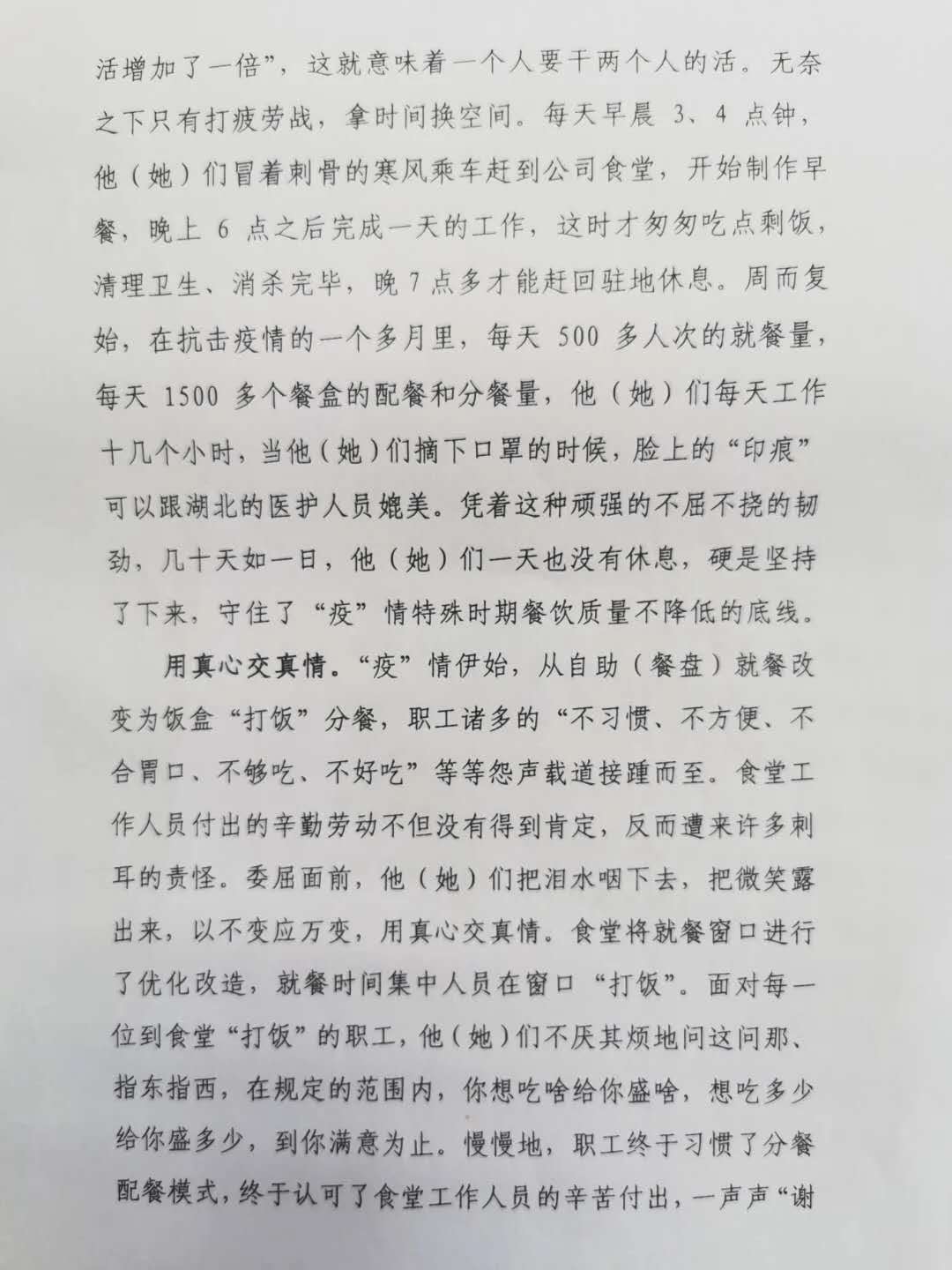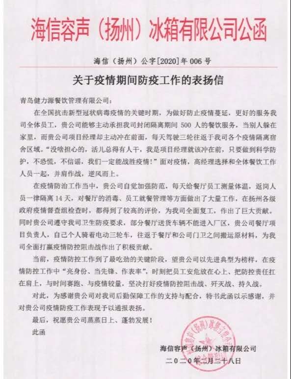 疫情面前,健力源人全力以赴,無(wú)怨無(wú)悔,配合客戶做好餐飲保障工作,特別是醫(yī)院項(xiàng)目的同事更為辛苦,從春節(jié)假期到現(xiàn)在,他們幾乎一直戰(zhàn)斗在抗擊病毒的前沿陣地上,為醫(yī)護(hù)人員保駕護(hù)航。正是憑借這種“特別能吃苦,特別能戰(zhàn)斗,特別能奉獻(xiàn)”的精神,健力源人在平凡的崗位上為戰(zhàn)疫工作貢獻(xiàn)了力量,也感動(dòng)了客戶。