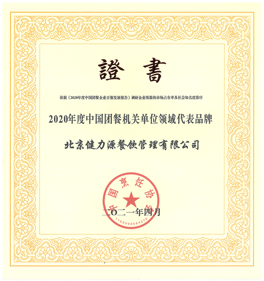 “2020年度中國(guó)團(tuán)餐機(jī)關(guān)單位領(lǐng)域代表品牌”榮譽(yù)證書(shū)