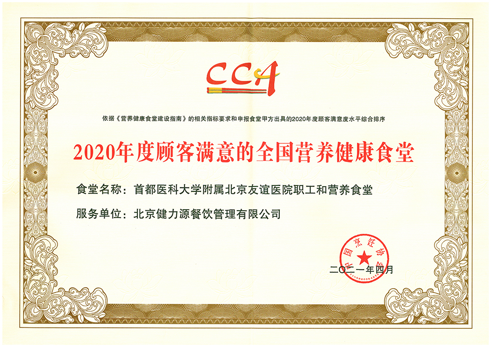 “2020年度顧客滿意的全國(guó)營(yíng)養(yǎng)健康食堂”榮譽(yù)證書(shū)