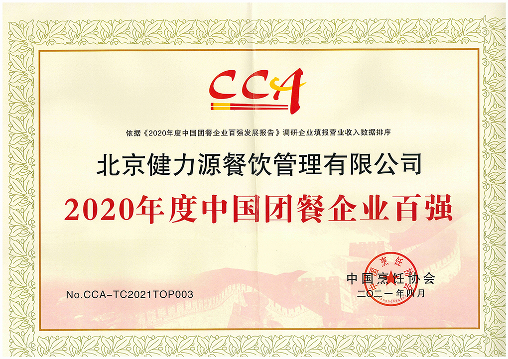 “2020年度中國(guó)團(tuán)餐企業(yè)百?gòu)?qiáng)”榮譽(yù)證書(shū)