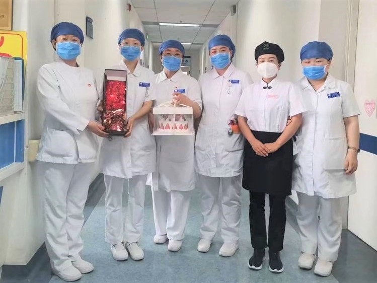 北京婦產(chǎn)醫(yī)院西院醫(yī)護(hù)人員展示餐廳贈(zèng)送的鮮花和蛋糕