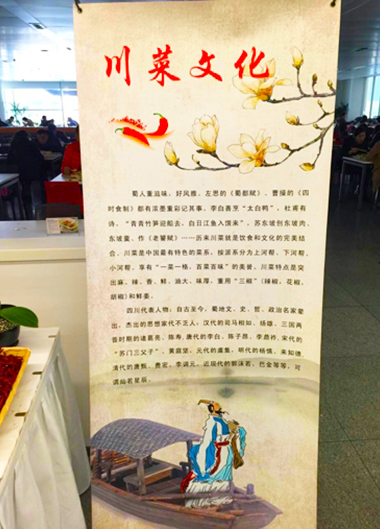 本次活動(dòng)主要突出一個(gè)字“辣”,這個(gè)“辣”字不僅僅體現(xiàn)在菜品上,在餐廳整體的布置上也處處有所體現(xiàn)。餐廳在每一入口處都擺放了宣傳板,宣傳板上兩個(gè)大大的紅辣椒,直接沖擊人們的視覺;展臺(tái)兩旁還懸掛著各種各樣“辣椒”形狀的裝飾品,精致可愛。為了讓更多的人了解辣椒,餐廳還查找了很多資料,對(duì)八種辣椒進(jìn)行了展示,并附上了詳細(xì)的介紹,包括辣椒的產(chǎn)地、辣椒的特點(diǎn)以及辣椒的用途等等,讓甲方員工對(duì)辣椒有了更新、更多的認(rèn)識(shí)。值得一提的是,餐廳還用扇子和臉譜對(duì)展臺(tái)的桌面進(jìn)行了裝飾,更加凸顯四川味道。